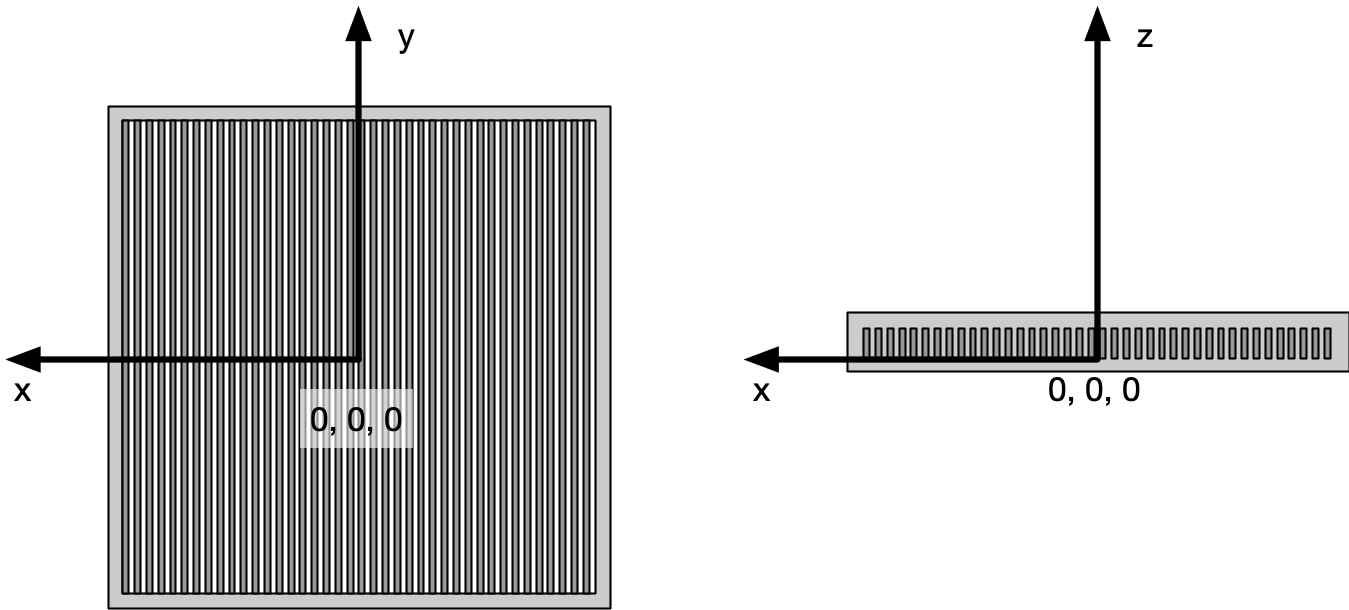 Assuming a collimator with a “flat” entry surface, the reference plane is the plane which contains this surface. The reference point of the collimator in the x and y axis is the centre of the collimator entry surface on that plane. The reference plane is orthogonal to the z axis and the location of this plane is the reference point on the z axis. The collimator faces negative z values.