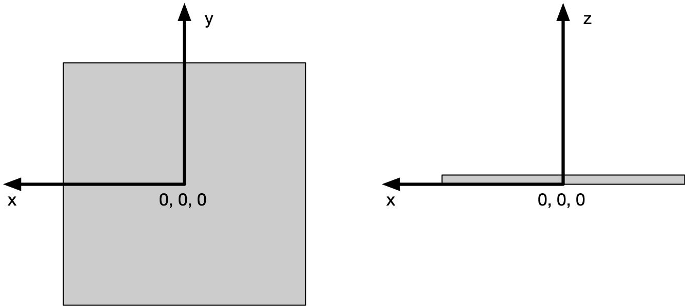 Given a flat mirror, the reference plane is the plane which contains the “entry” surface of the mirror. The reference point of the mirror in the x and y axis is the centre of the mirror on that plane. The reference plane is orthogonal to the z axis and the location of this plane is the reference point on the z axis. The mirror faces negative z values.