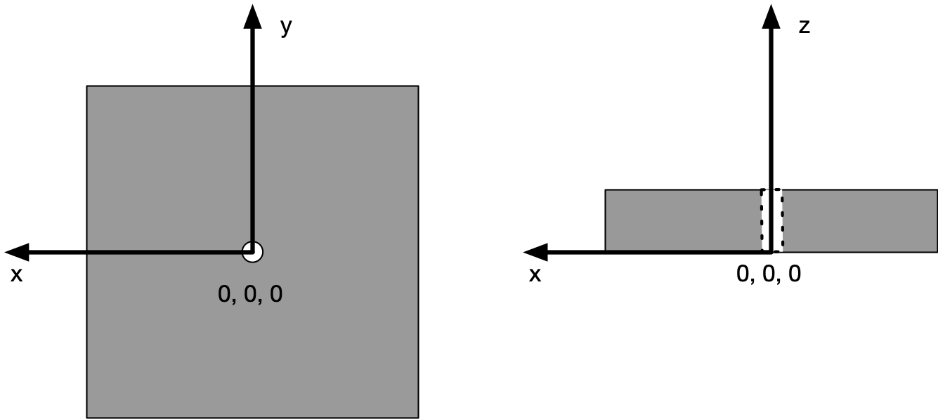 The reference direction of the pinhole is parallel with the z axis. The reference point of the pinhole is its center in the x and y axis. The reference point on the z axis is the plane which overlaps the side of the opening of the pin hole pointing towards the source (minus on the z axis).