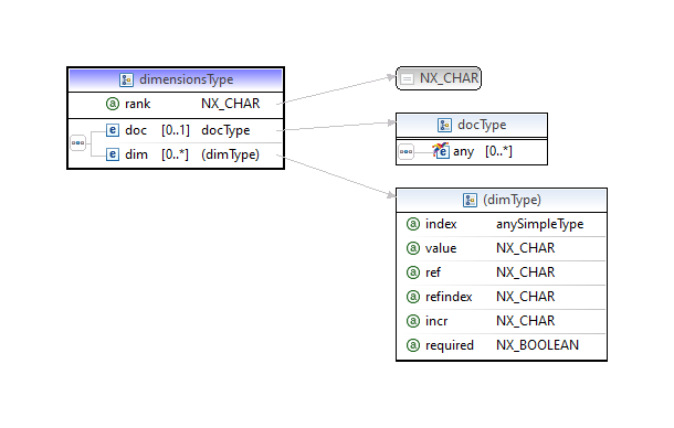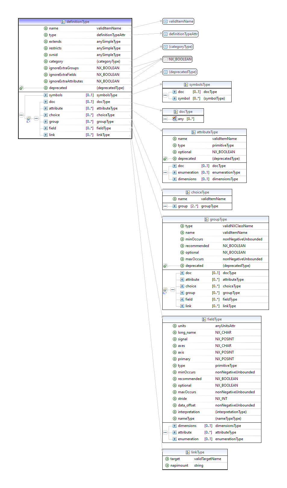 The documentation in this section has been obtained directly from the NXDL Schema file: nxdl.xsd. First, the basic elements are defined in alphabetical order. Attributes to an element are indicated immediately following the element and are preceded with an “@” symbol, such as @attribute. Then, the common data types used within the NXDL specification are defined. Pay particular attention to the rules for validItemName and validNXClassName.