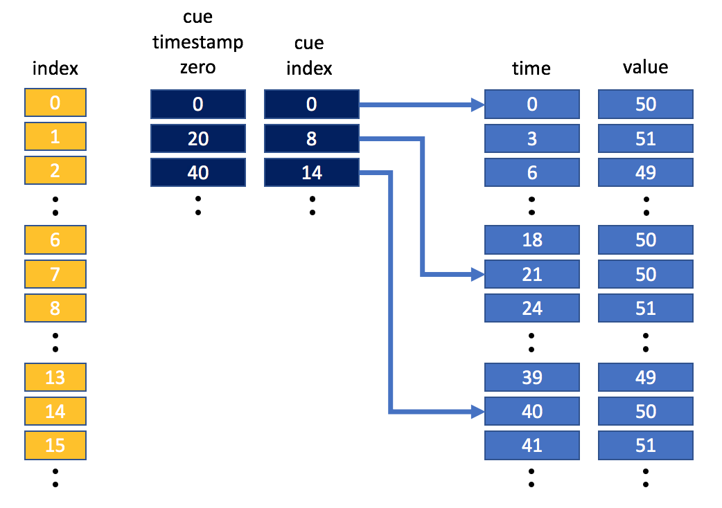 Let’s consider the case where NXlog is being used to store sample temperature data that has been sampled once every three seconds. The application that wrote the data has added cues every 20 seconds. Pictorially, this may look something like this: