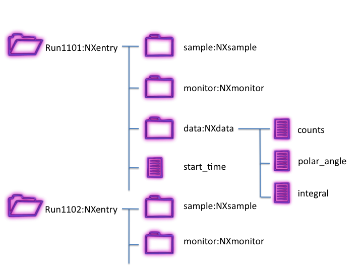 The following diagram shows an example of a NeXus data file represented as a tree structure.