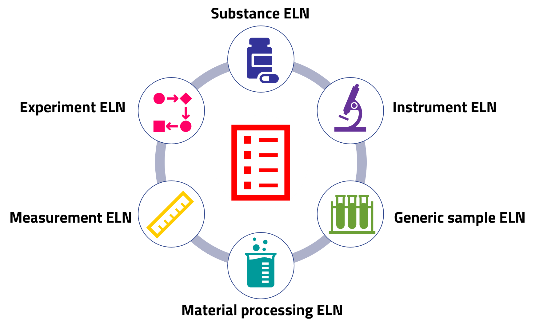 - Create ELN entries for substances, samples, instruments, processes, and measurements using built-in schemas