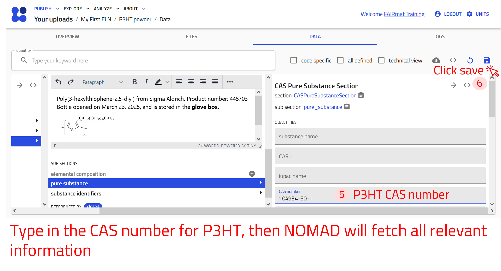 Create an ELN entry in NOMAD for P3HT solution in chloroform. Reference the sample to its components (P3HT powder and chloroform).