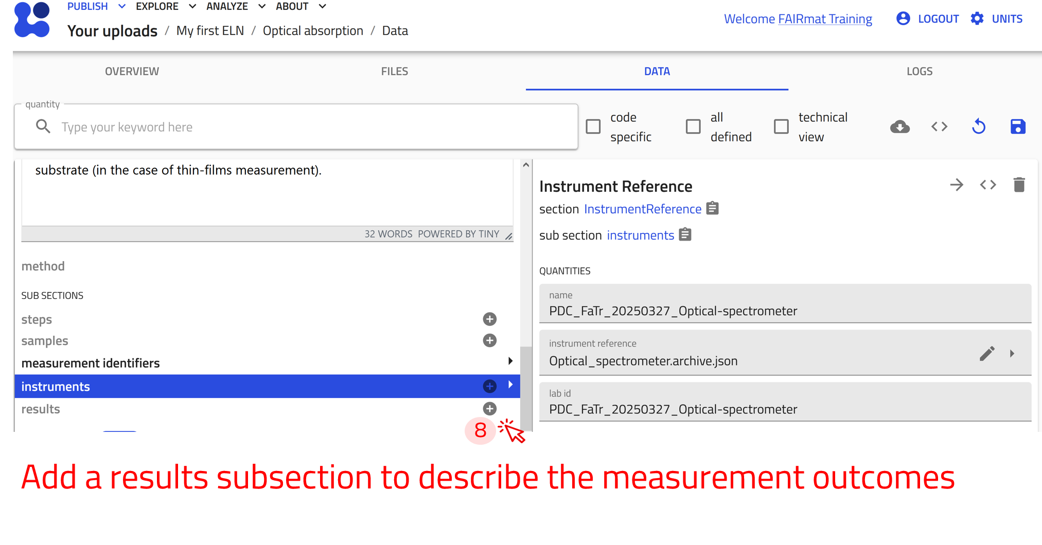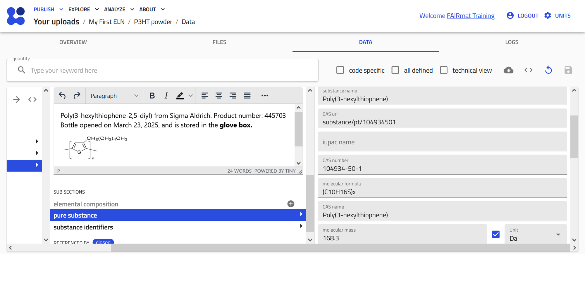 To effectively document this experiment, we will create and interlink electronic lab notebook (ELN) entries in NOMAD. These entries will include key entities such as substances, instruments, and samples, as well as activities like material processing and measurements. By structuring the data in this way, we ensure a comprehensive and FAIR-compliant record of the experiment.