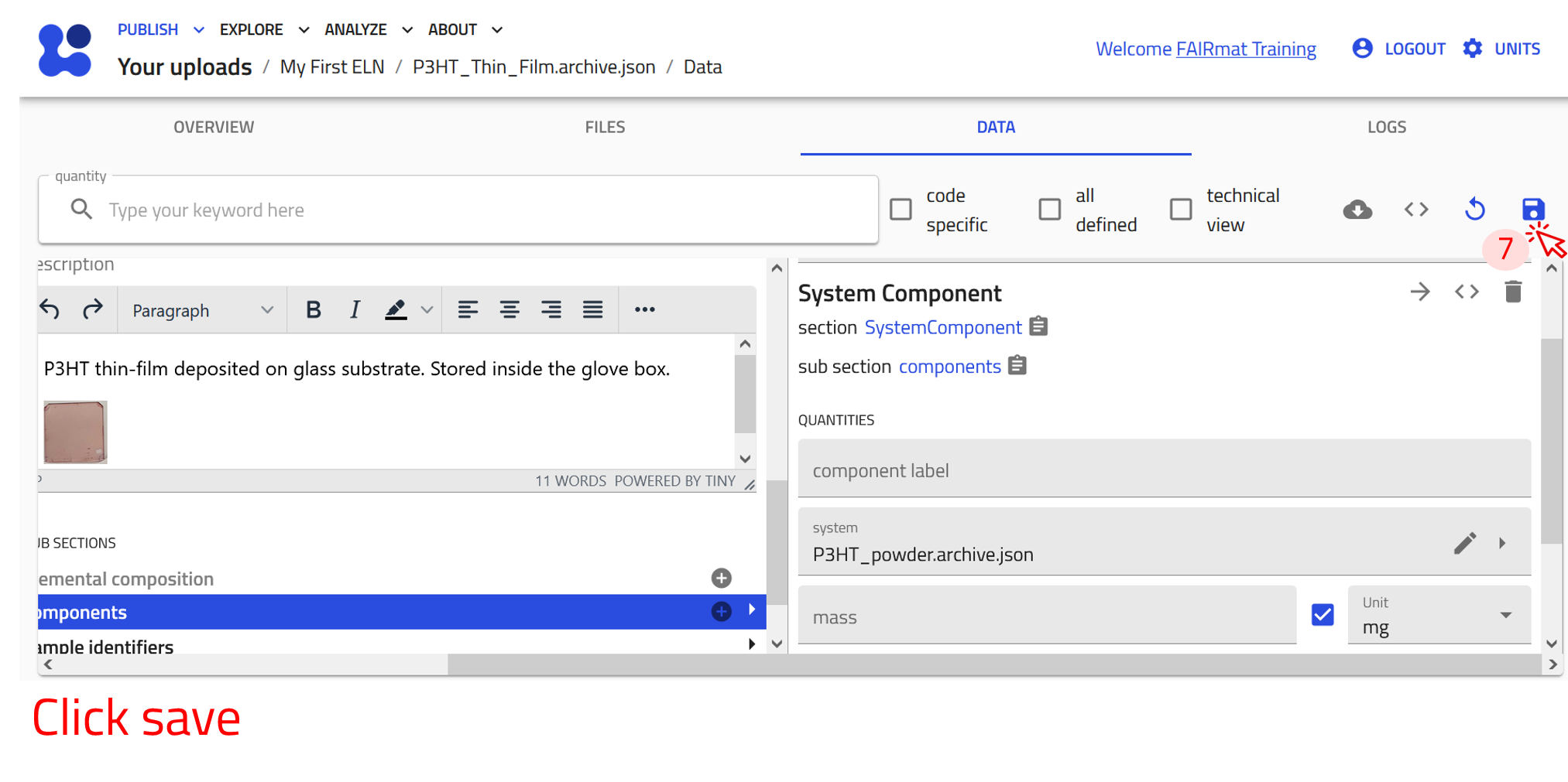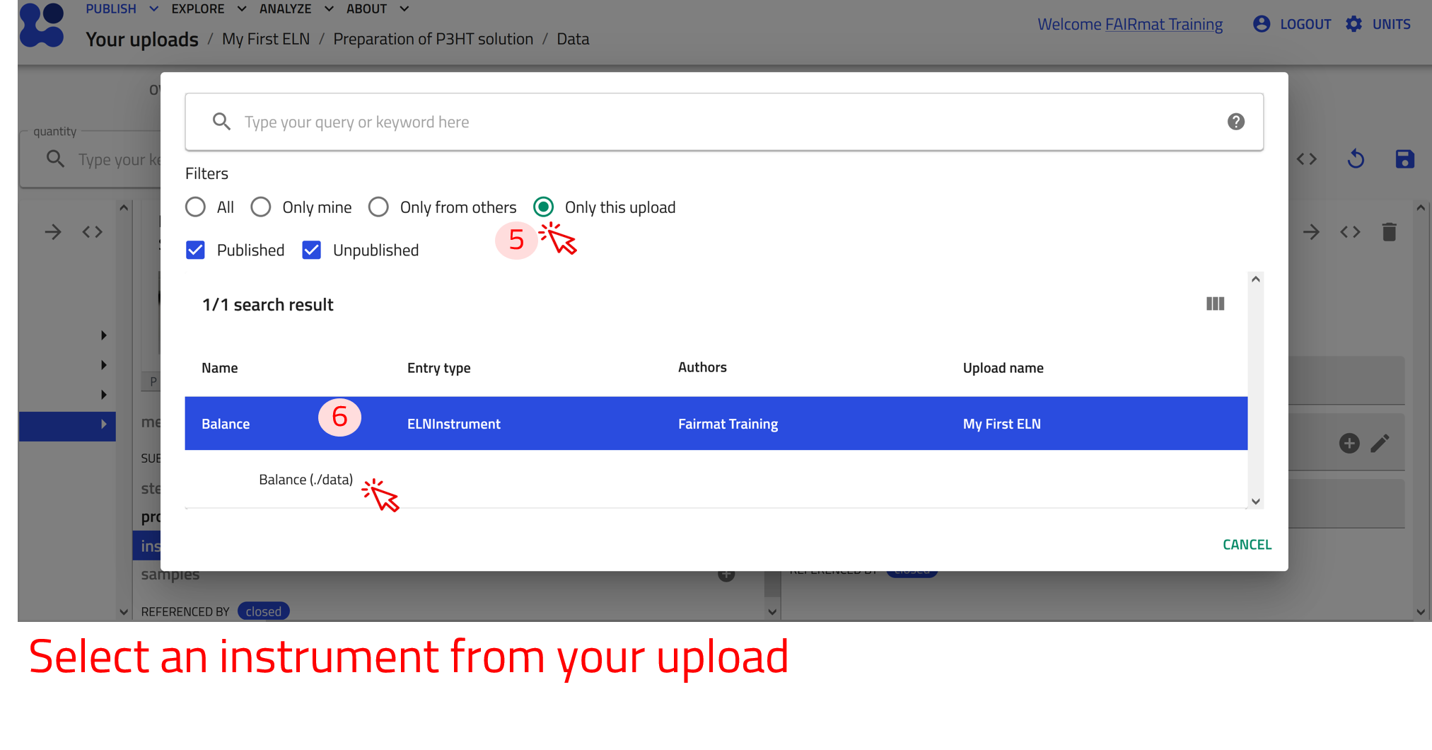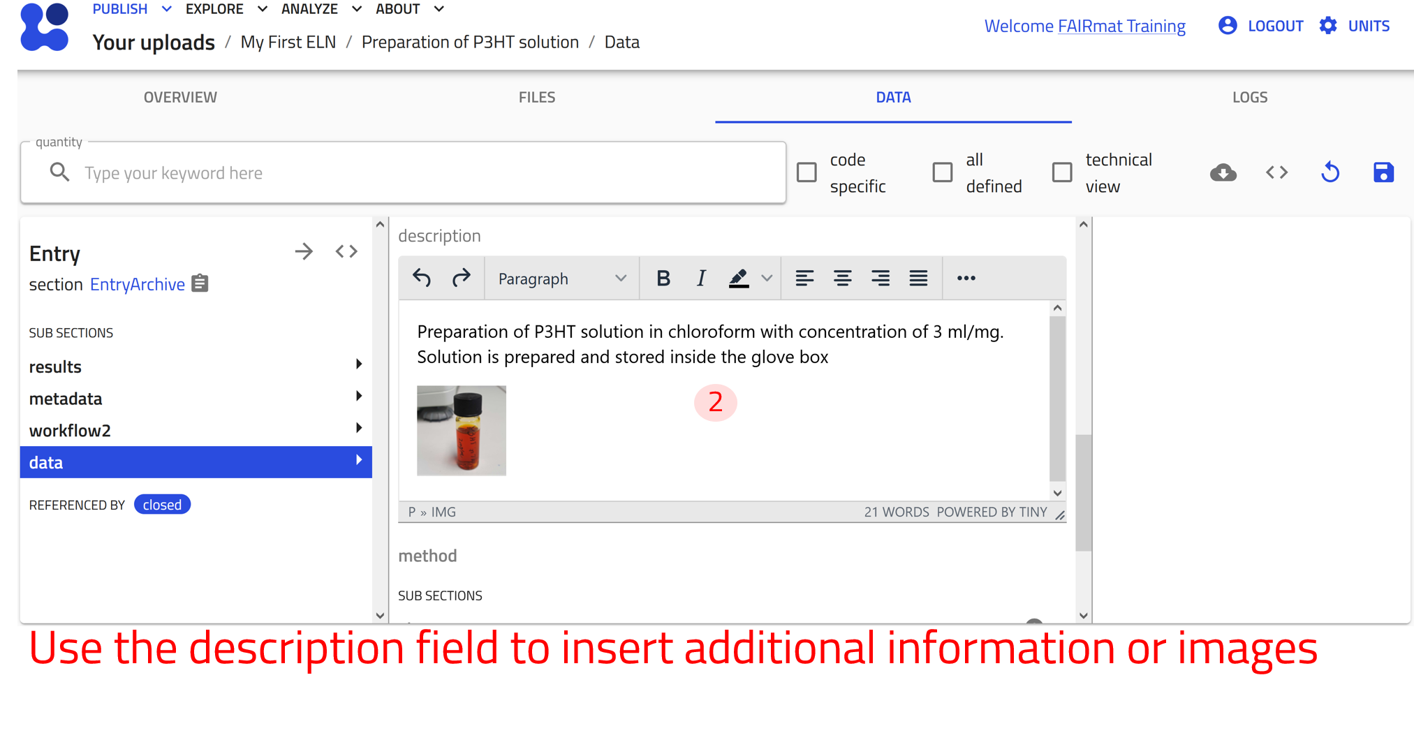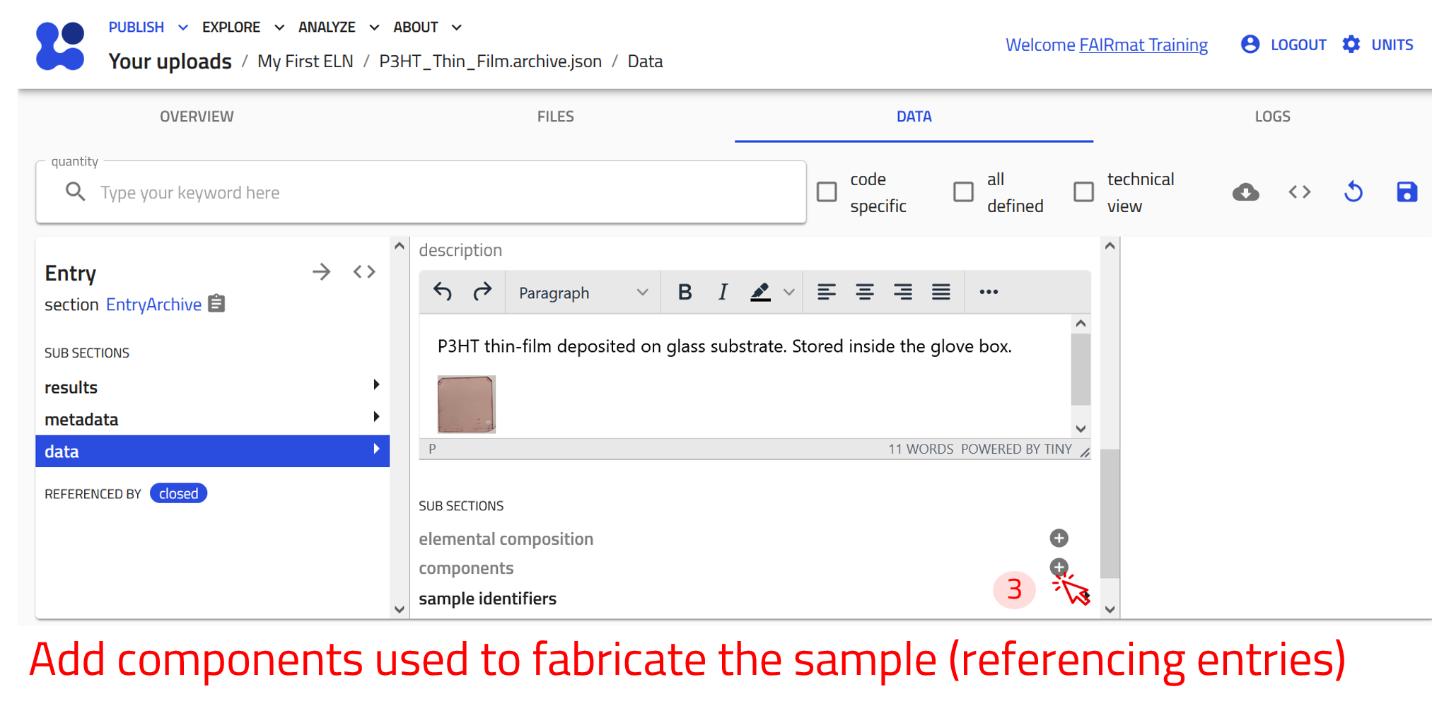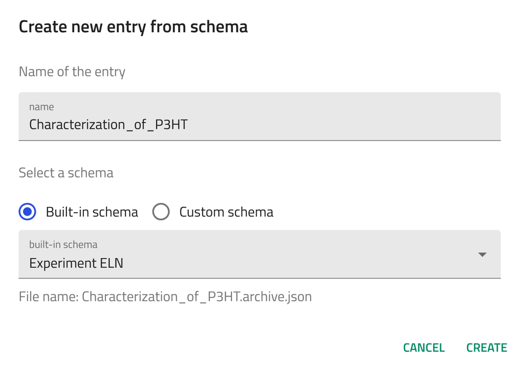 Now create an entry using the built-in Experiment ELN schema for Characterization of P3HT. Follow the steps of creating an entry described above and select Experiment ELN from the drop-down menu in step 4.