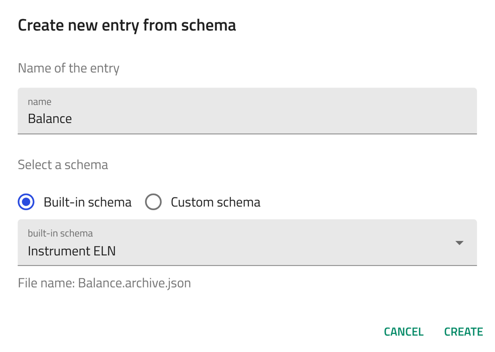 Now, let's create an entry using the built-in Instrument ELN schema for scale. Follow the steps of creating an entry described above and select Instrument ELN from the drop-down menu in step 4.