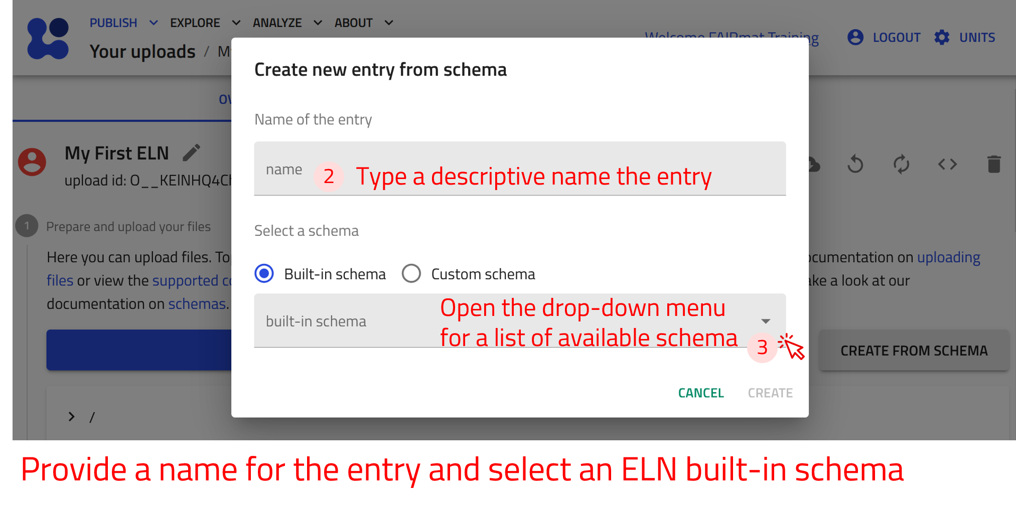 Use the arrow buttons ⬅️➡️ below to follow the steps for creating ELN entries using the built-in schema.