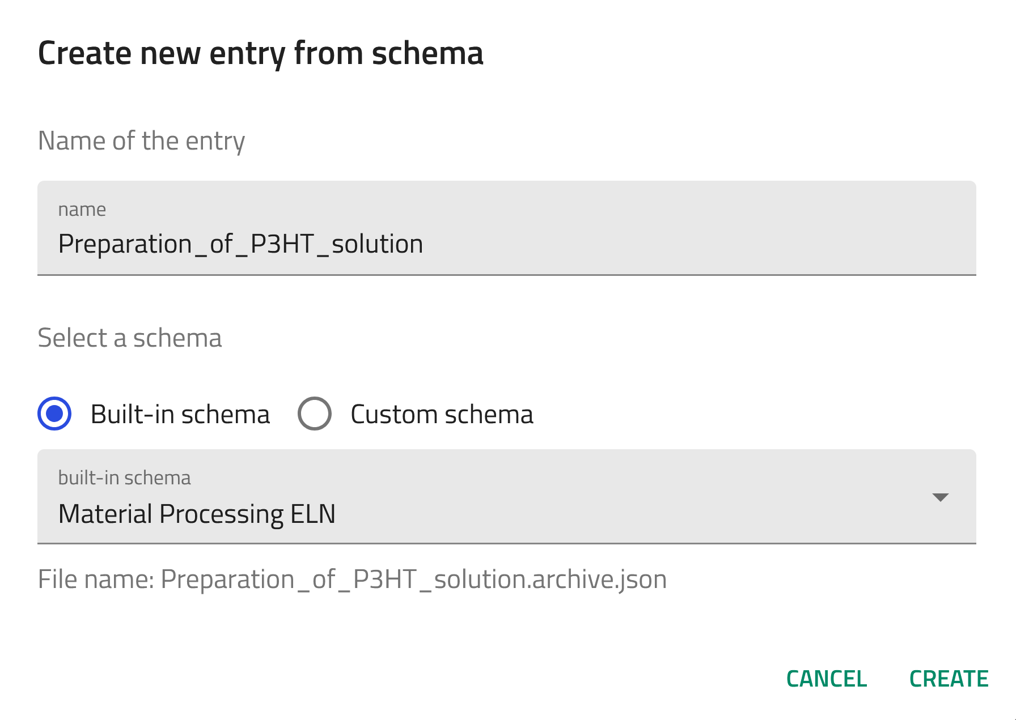 Now, let's create an entry using the built-in Material Processing ELN schema for Preparation of P3HT solution. Follow the steps of creating an entry described above and select Material Processing ELN from the drop-down menu in step 4.