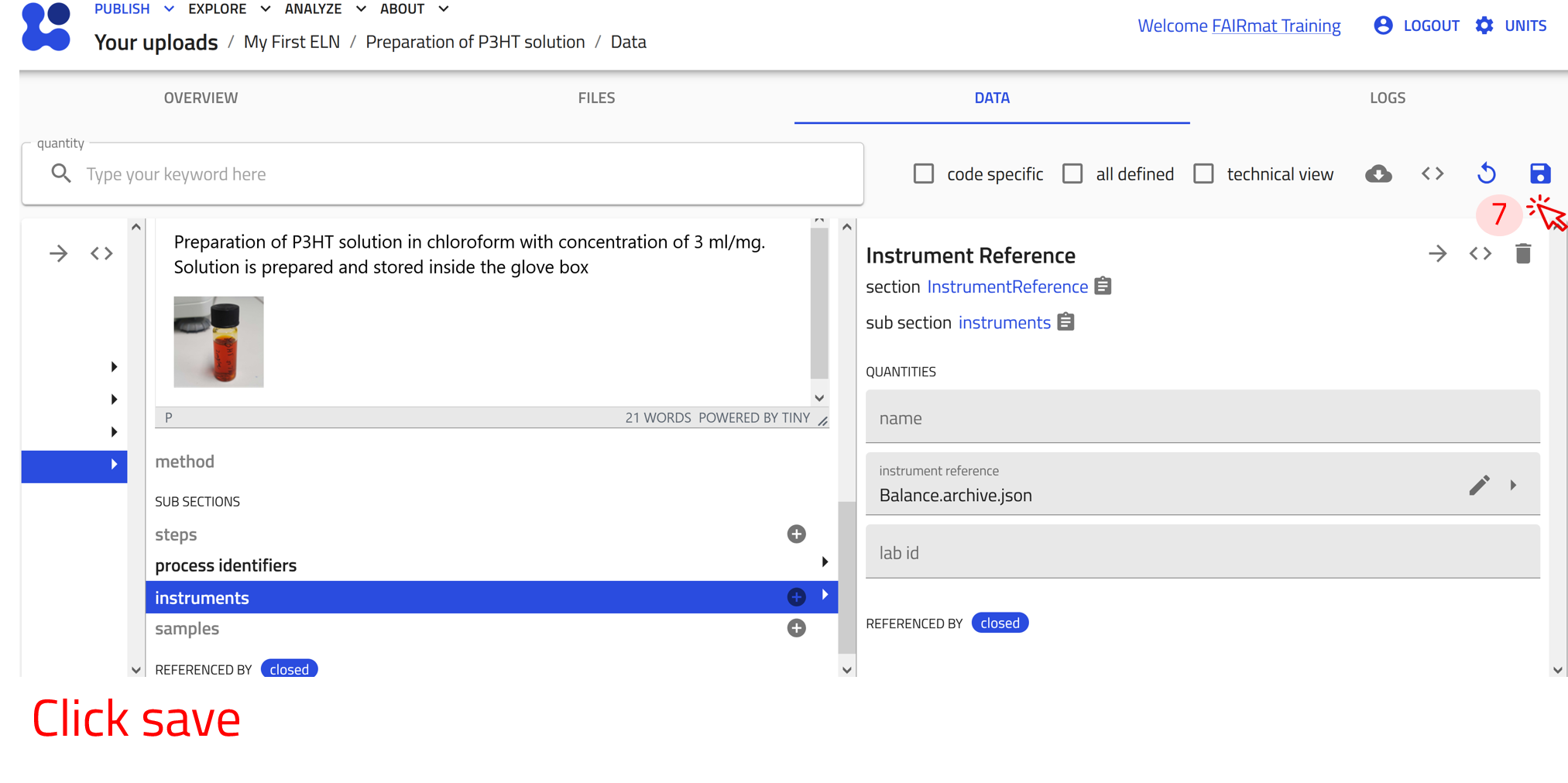- If the sample entry does not exist, first create a Sample ELN entry named P3HT_solution_in_CF, then add the reference in the Process ELN entry.