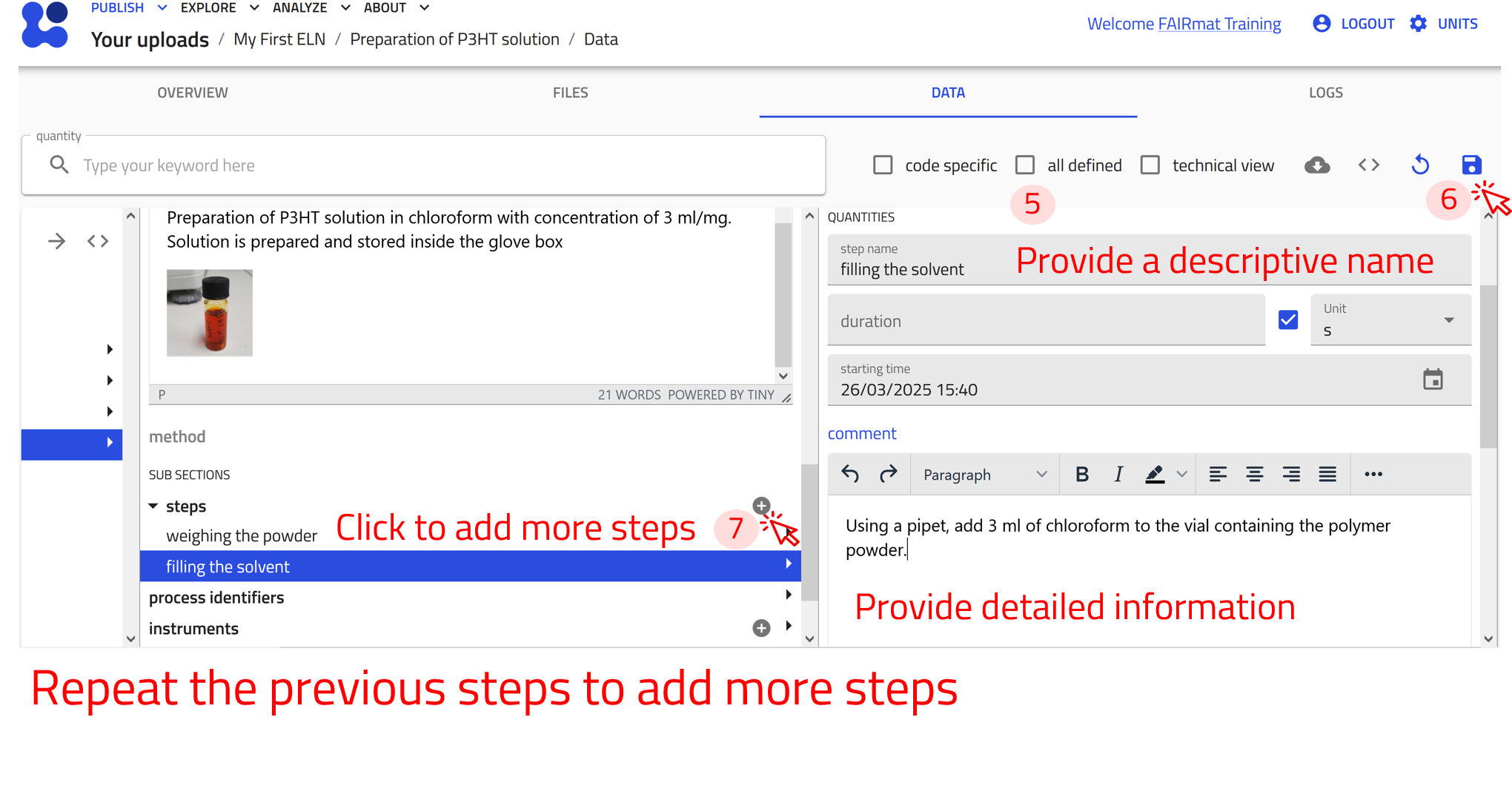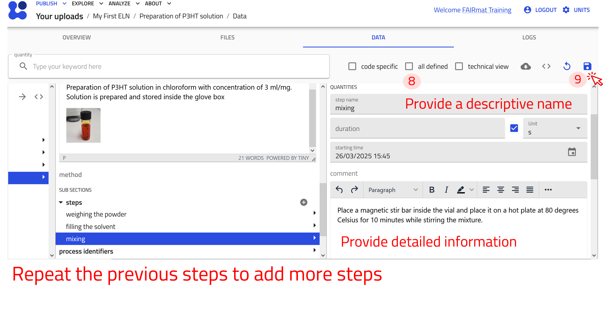 For the example process entry Preparation of P3HT solution, we will define the following three steps: