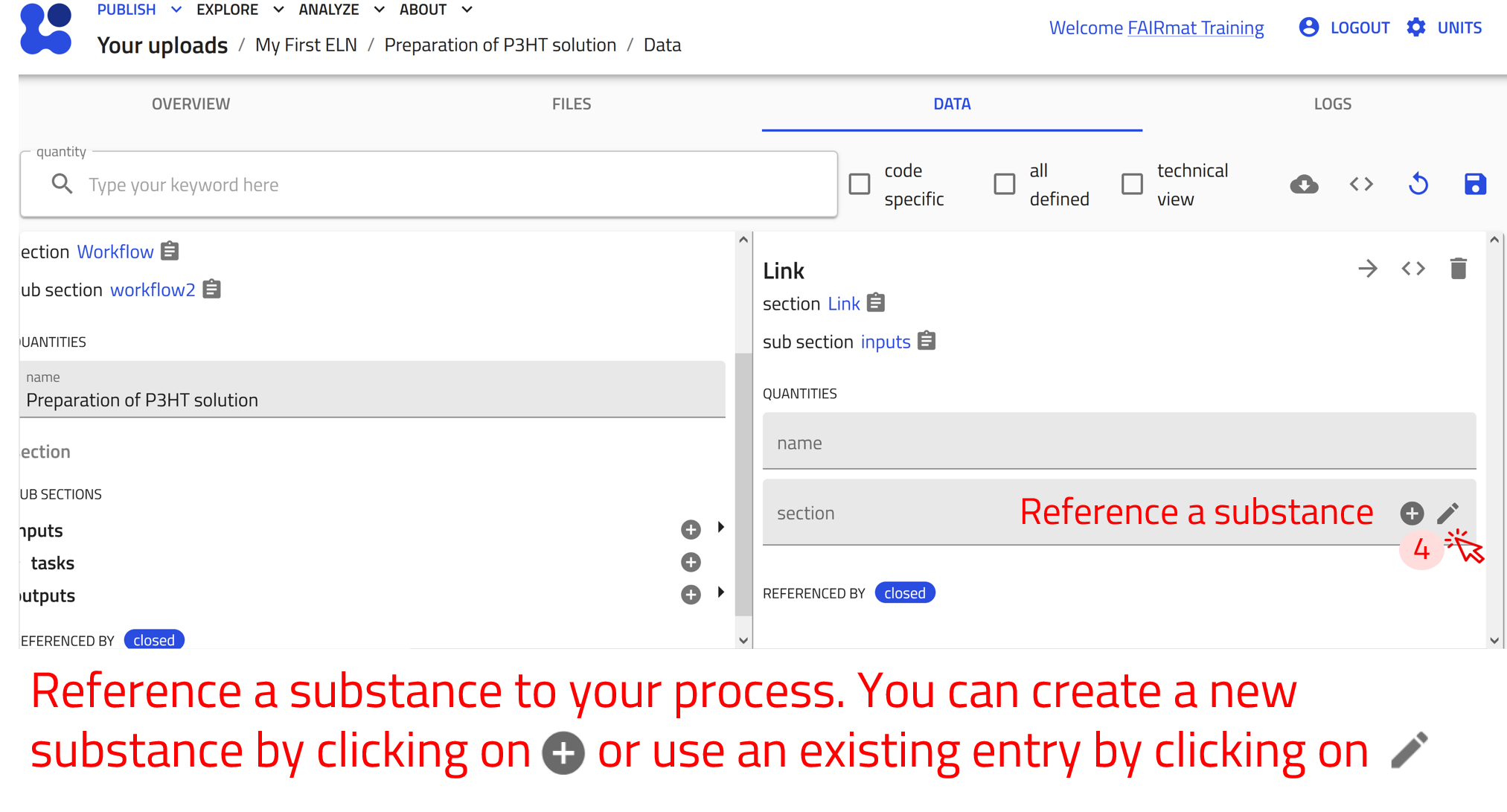 The workflow2 section of the Preparation of P3HT solution example can be found under the DATA tab, in the left panel under workflow2. We can now add inputs by referencing existing substance entries.