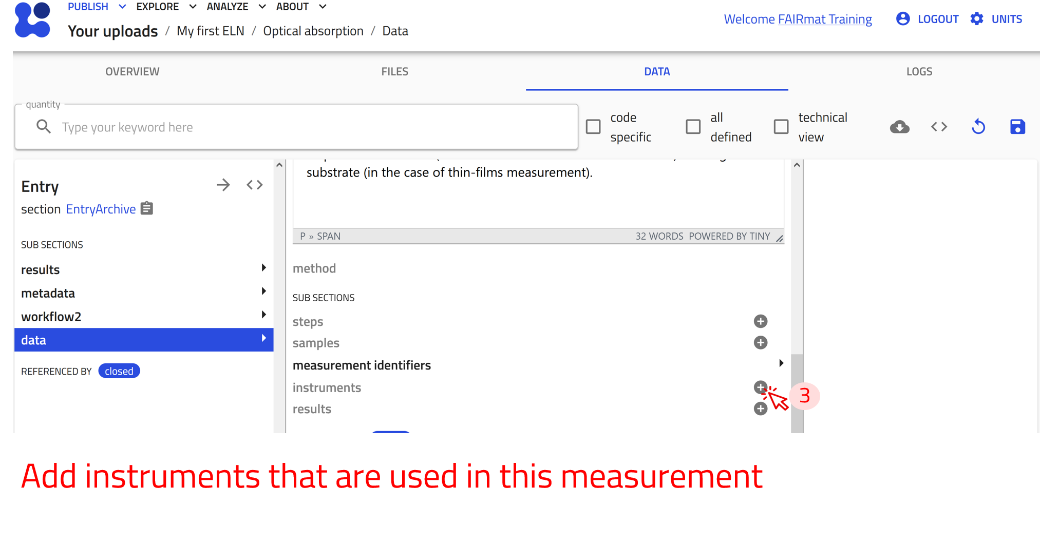 The next step is to create entries for your substances, instruments, processes, and measurements. In NOMAD, each ELN entry is structured using templates called built-in schemas. These templates are specifically designed to capture relevant information for different types of entries, ensuring consistency and completeness in documentation.