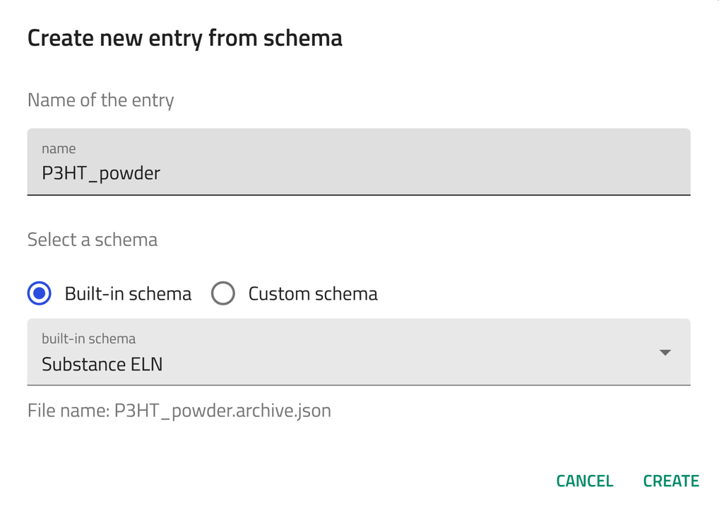 Now, let's create an entry using the built-in Substance ELN schema for P3HT powder. Follow the steps of creating an entry described above and select Substance ELN from the drop-down menu in step 4.