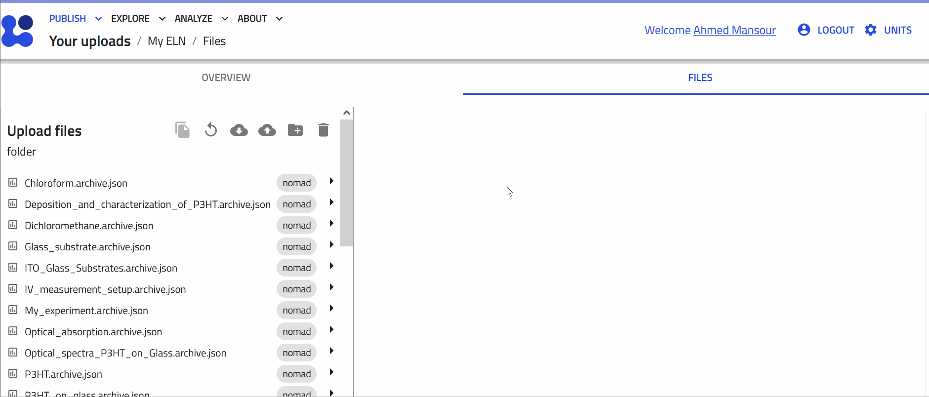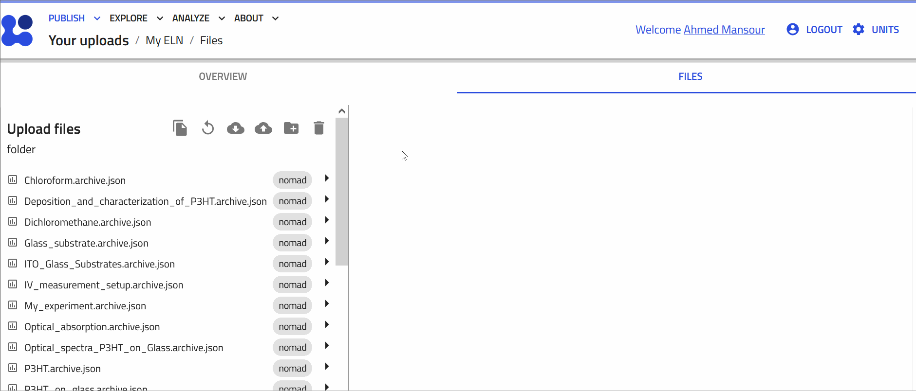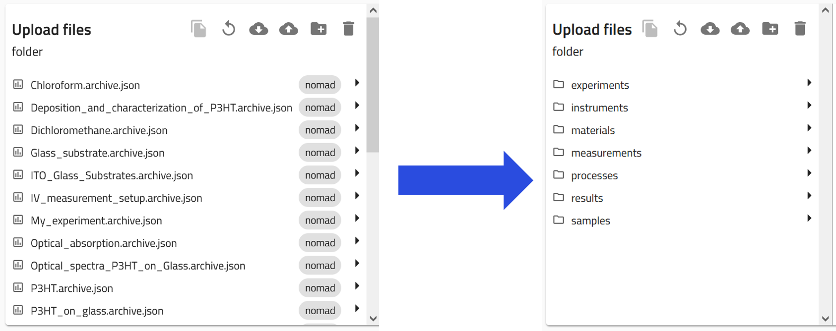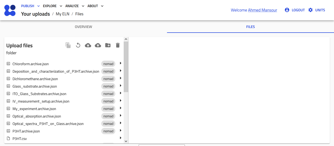 NOMAD is a file-based system. You can access, organize, and download your files within each upload. You can also create folders to categorize entries into materials, samples, instruments, processes, and results, as well as upload additional documents, such as relevant PDFs.