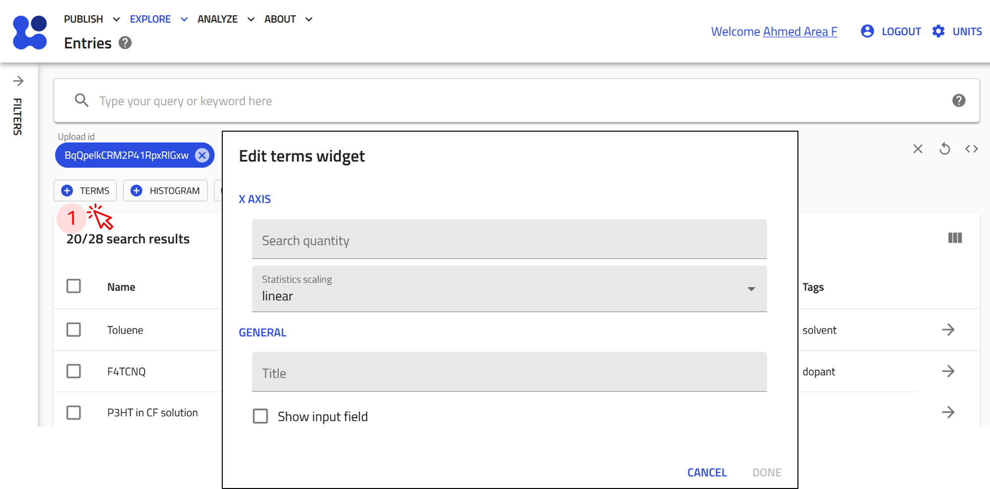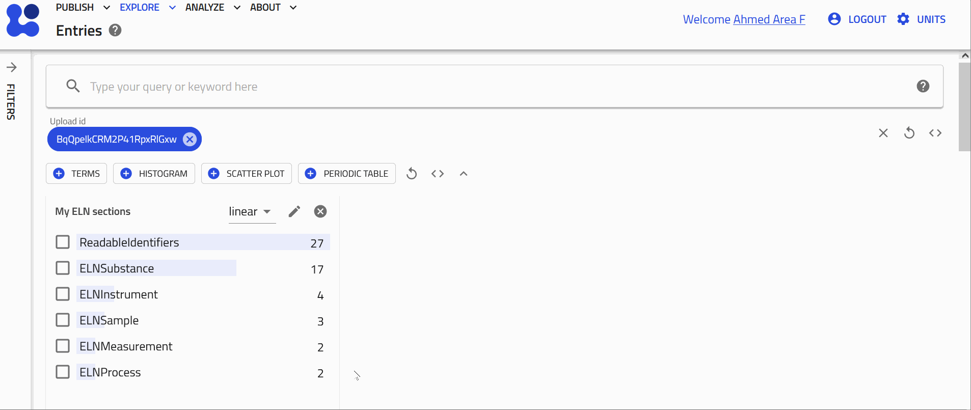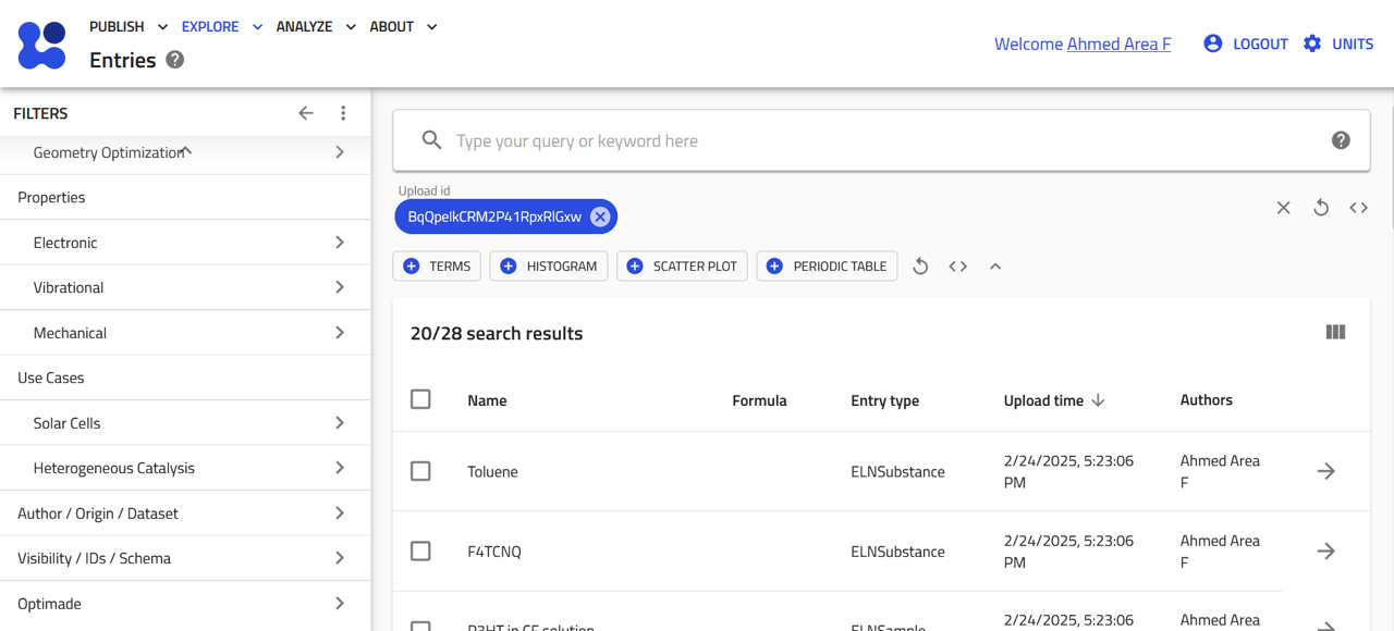 This will open NOMAD's EXPLORE page with a filter applied to display only the entries from your upload.