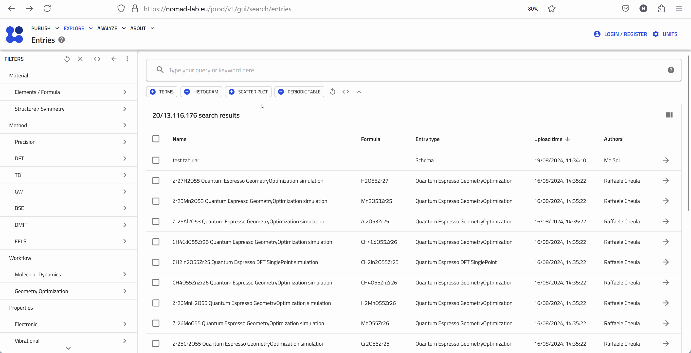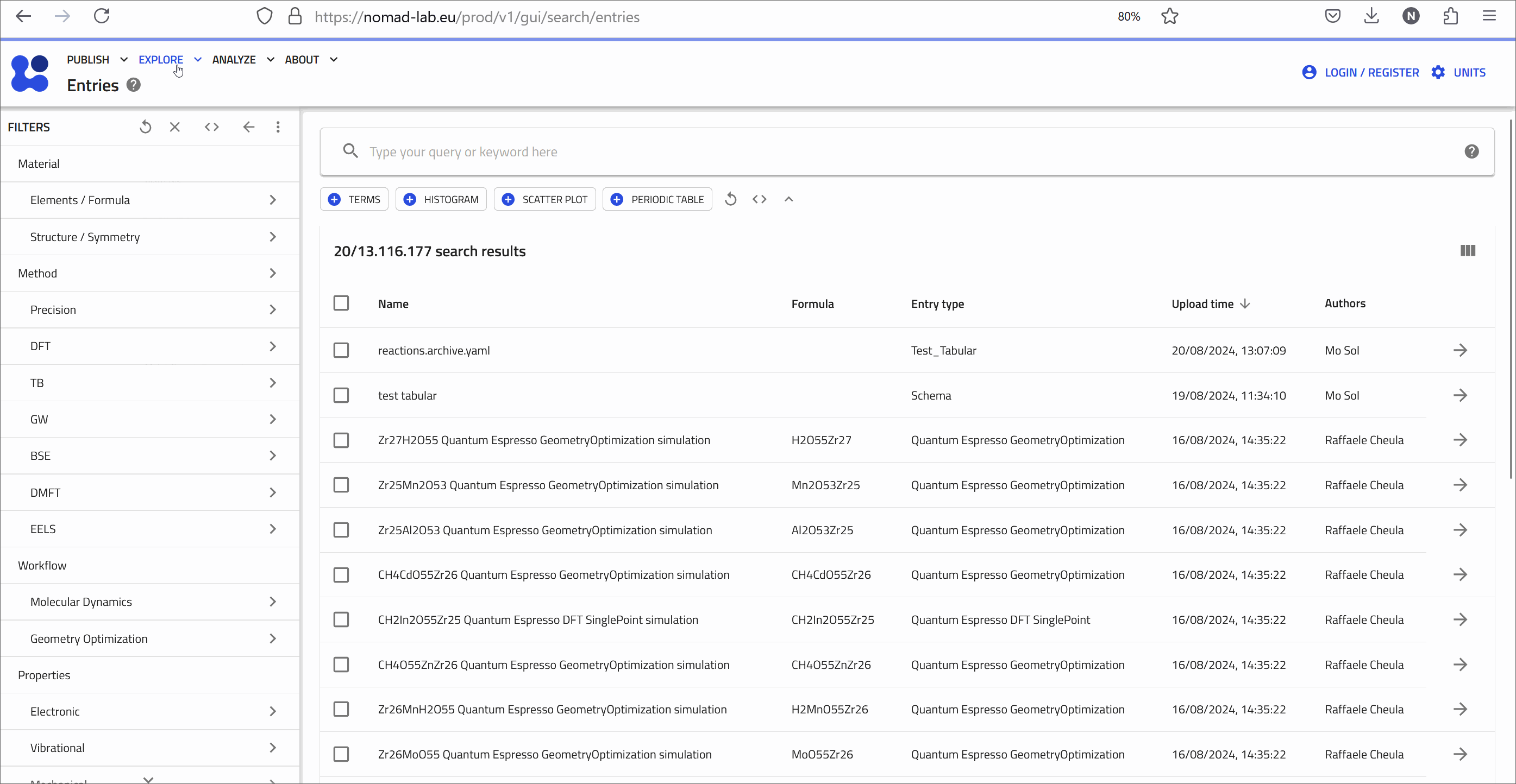 The Entries page shows all the uploaded data that are published on NOMAD. Published entries are accessible without login, while logging in grants access to your private data and those that are shared with you.