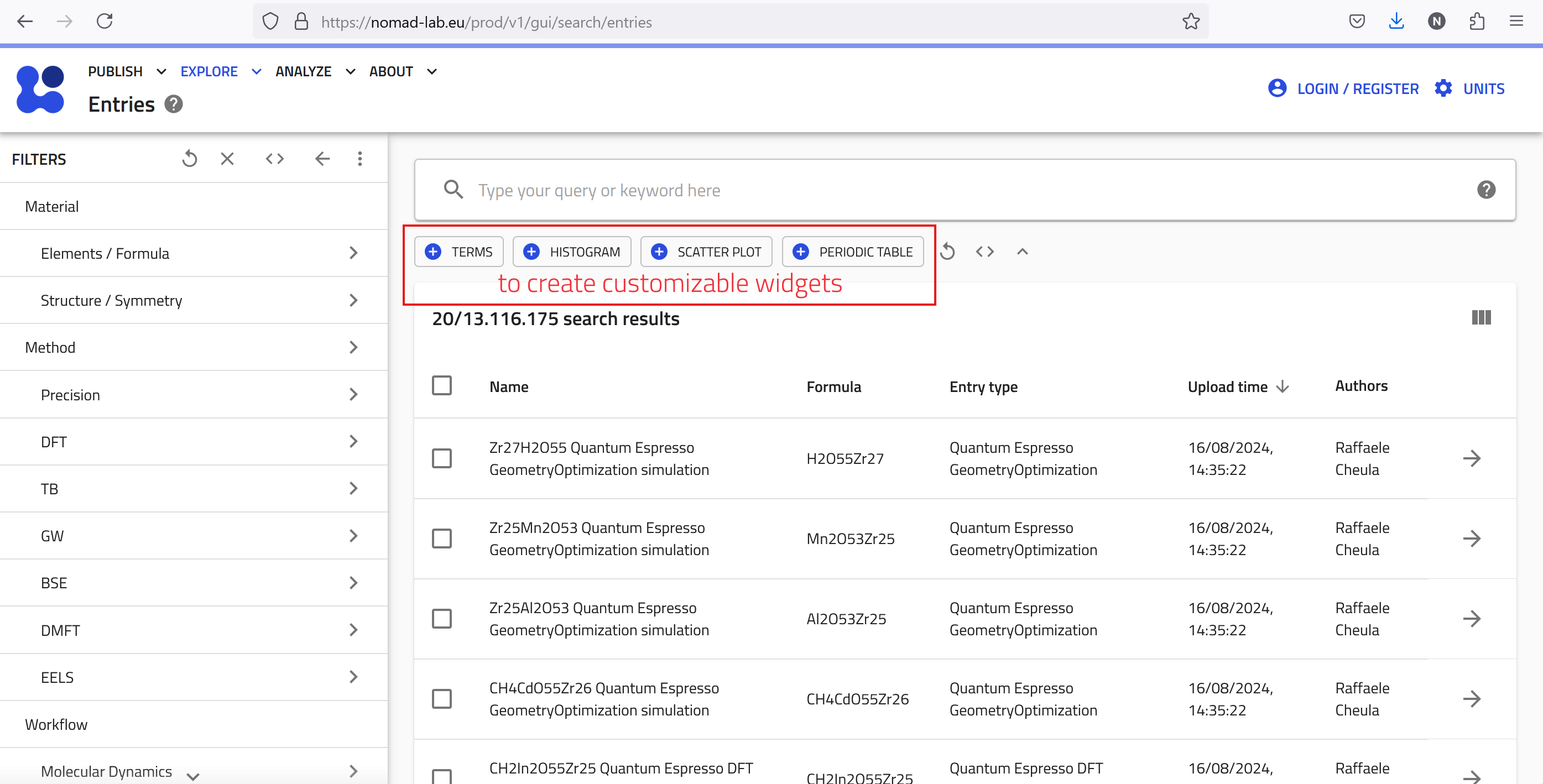 NOMAD also offers custom widgets to create advanced dashboards. These widgets are accessible below the search bar on any EXPLORE page.