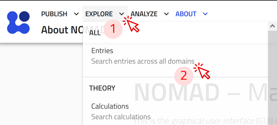 To start with exploring data across all domains in NOMAD, go to EXPLORE → Entries.