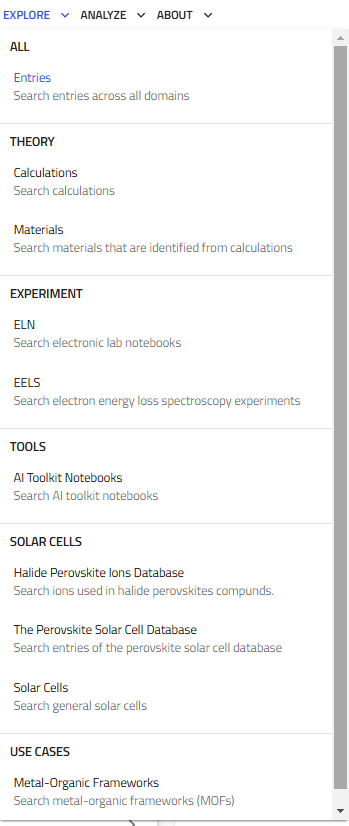 The EXPLORE menu allows you to navigate and search through a vast amount of materials-science data. It provides several options, each focusing on a specific application or method. They include different sets of filters and/or search widgets that allow users to efficiently filter and narrow down results, making it easier to find relevant entries in specific domains.