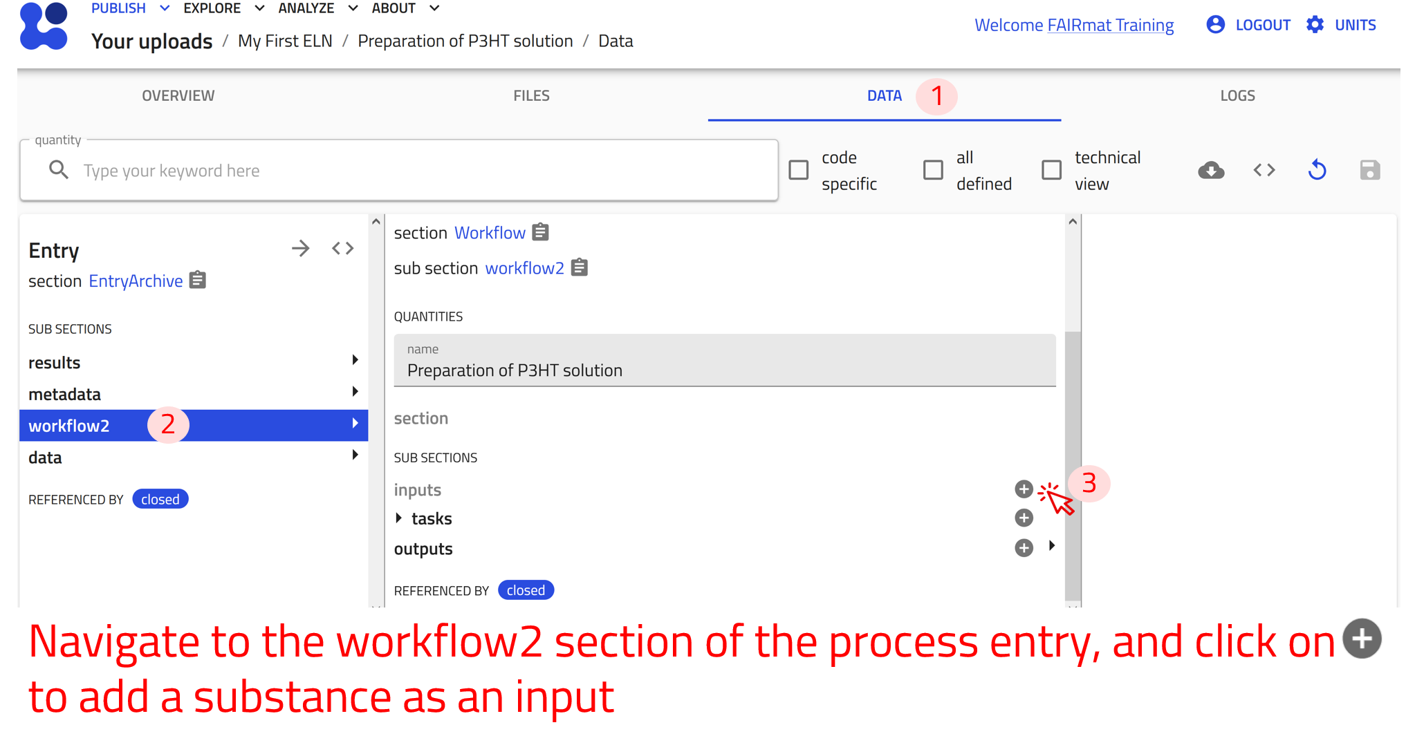 The workflow2 section of the Preparation of P3HT solution example can be found under the DATA tab, in the left panel under workflow2. We can now add inputs by referencing existing substance entries.