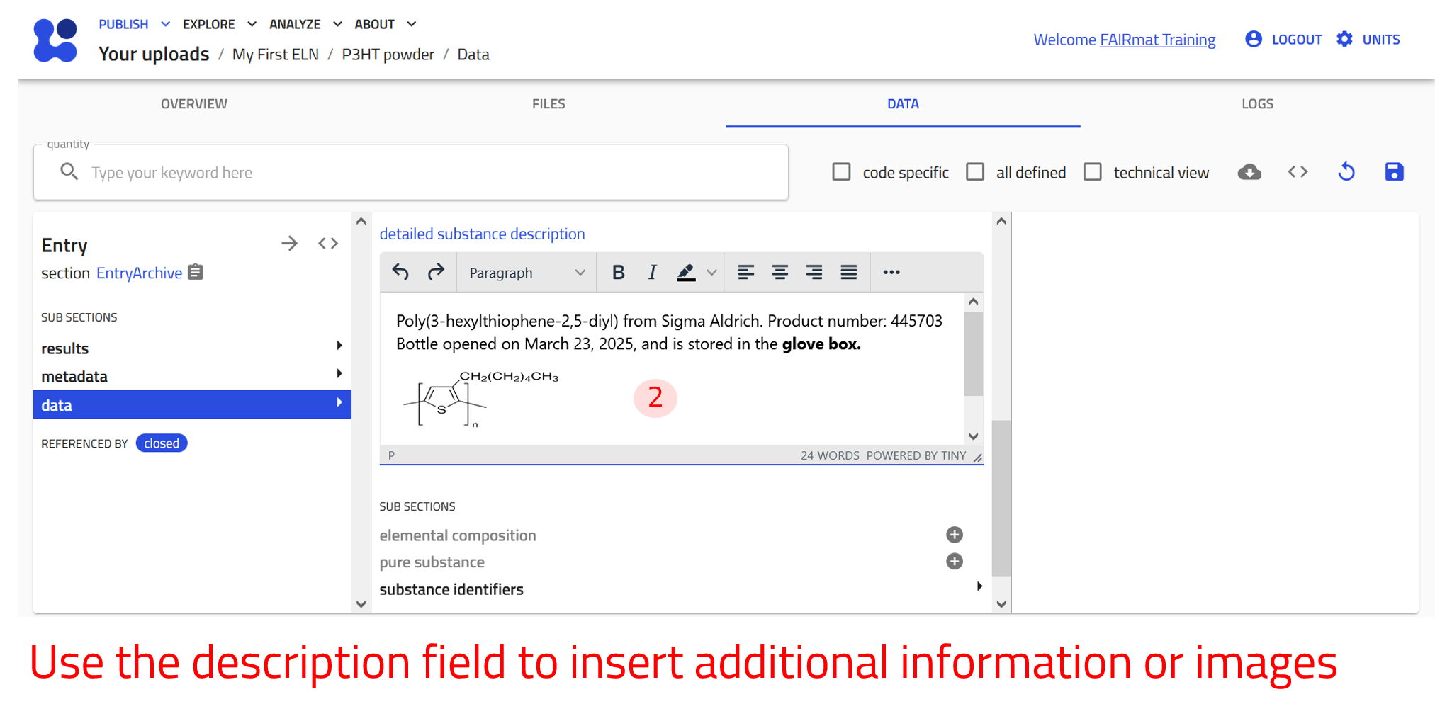 Now create an entry using the built-in Experiment ELN schema for Characterization of P3HT. Follow the steps of creating an entry described above and select Experiment ELN from the drop-down menu in step 4.